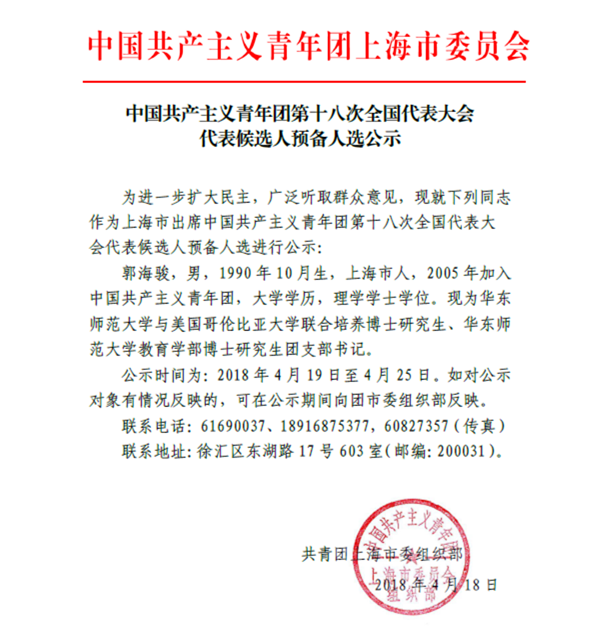 中国共产主义青年团第十八次全国代表大会代表候选人预备人选公示(公示已结束)