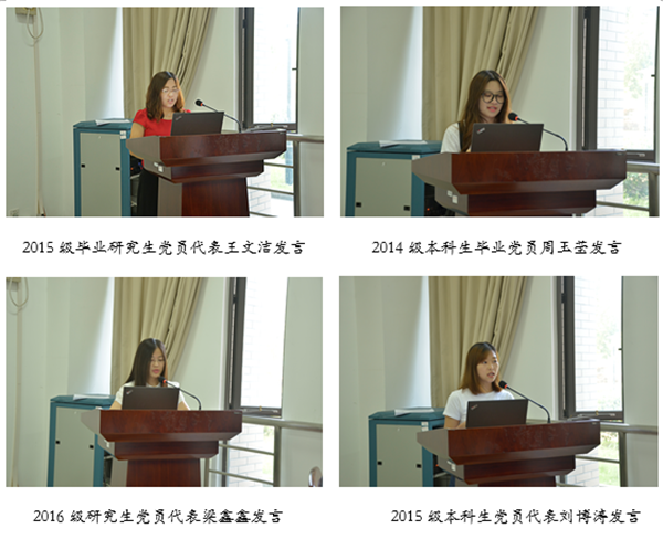 2018年新发展党员和预备党员合影 接下来是来自本科和研究生的4位优秀党员代表进行发言,研究生优秀毕业生党员代表王文洁分享了自己在这四年中的收获,她表示,研究生三年她收获颇丰,在学生工作和学业上均取得不错的成绩,同时感谢学院老师的栽培;本科优秀毕业生党员代表周玉莹同学认为大学时光转瞬即逝,我们应珍惜时光,不懈奋斗,肩负起时代赋予我们的责任;2016级研究生党员代表梁鑫鑫同学分享了她在师大六年的学习时光和从事党务工作两年以来的收获与感受,她时刻提醒自己做到习总书记要求的“平常时候看得出来,关键时刻站得出来”。本科生党员代表刘博涛分享了她在学习工作的收获和体会。